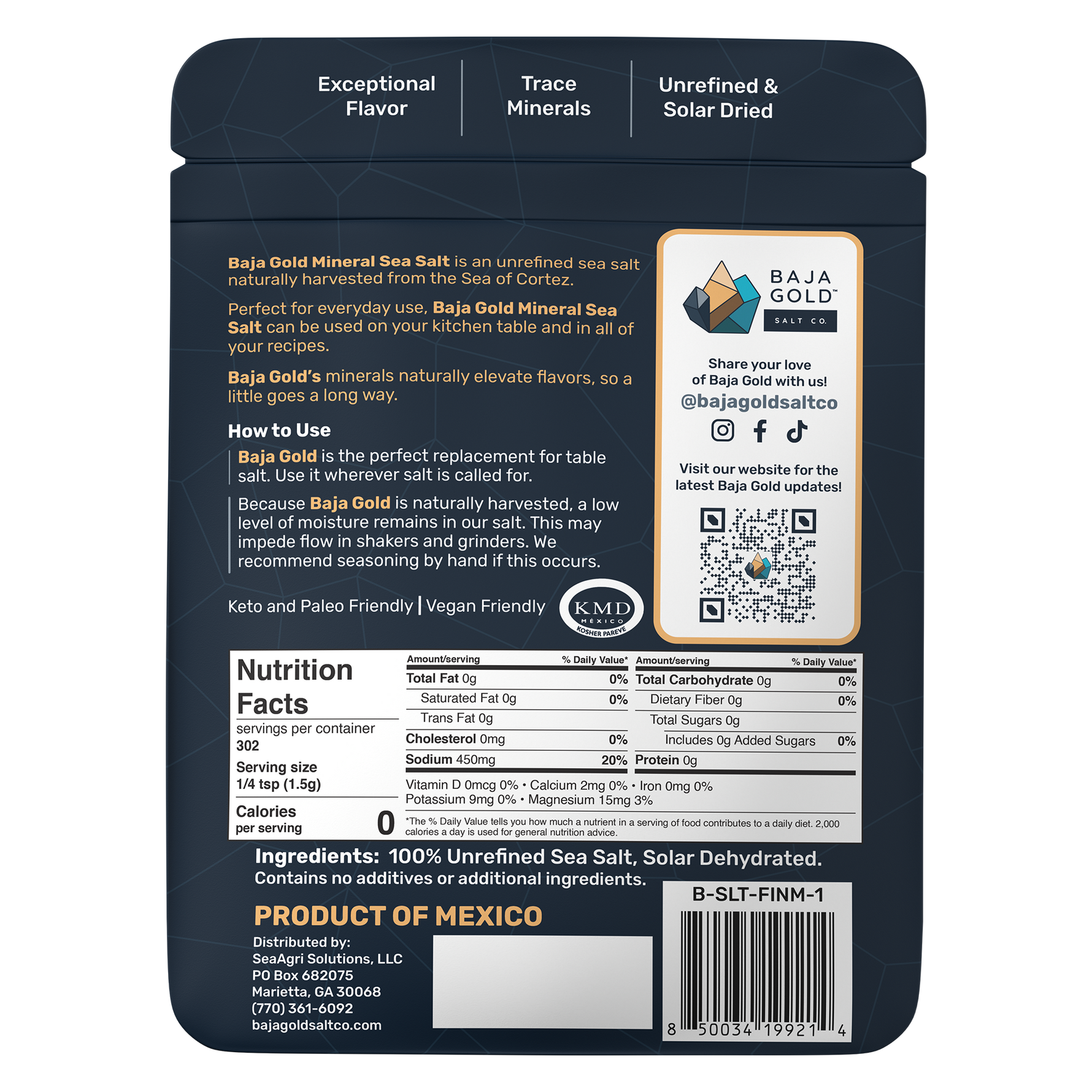 Baja Gold Mineral-Meersalz ist das gesündeste und schmackhafteste Meersalz der Welt. Es stammt aus dem Golf von Kalifornien und ist reich an Mineralien und Spurenelementen (über 90 essenzielle Mineralien ). Dank seines geringeren Natriumgehalts bietet es einen besseren Geschmack und wirkt sich positiv auf Ihre Gesundheit aus.